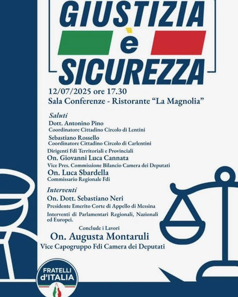 “Difendere chi ci difende non è uno slogan, è un dovere. Con il Decreto Sicurezza tuteliamo le forze dell’ordine, contrastiamo le occupazioni abusive e restituiamo centralità ai principi di legalità, ordine e giustizia”. Lo dichiara Luca Cannata, vicepresidente della Commissione Bilancio alla Camera dei Deputati, annunciando l’incontro pubblico sul tema “Giustizia e Sicurezza” che si terrà sabato 12 luglio alle 17.30 nella Sala Conferenze del Ristorante ‘La Magnolia’ a Lentini, promosso dai Circoli di Fratelli d’Italia di Lentini e Carlentini.
